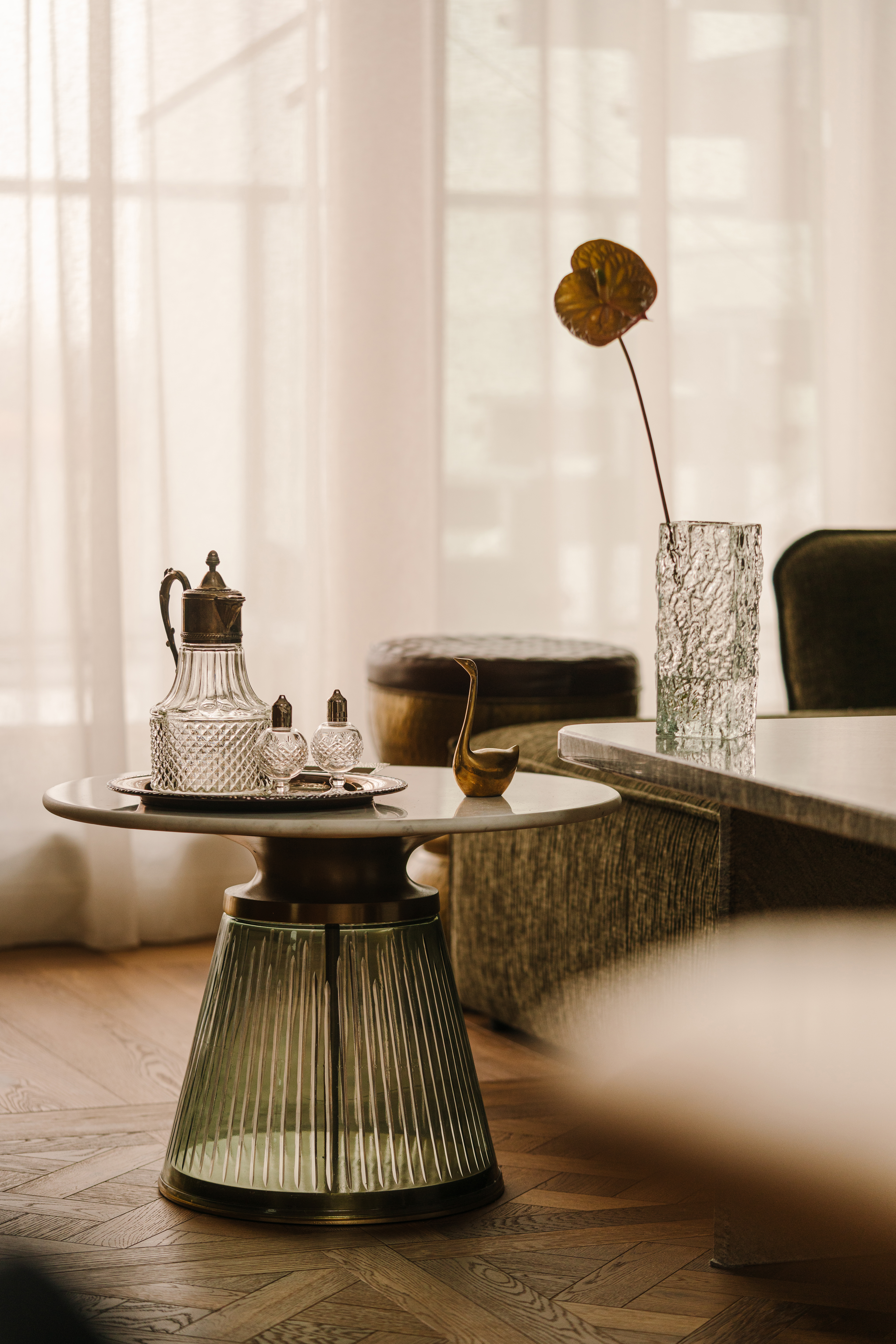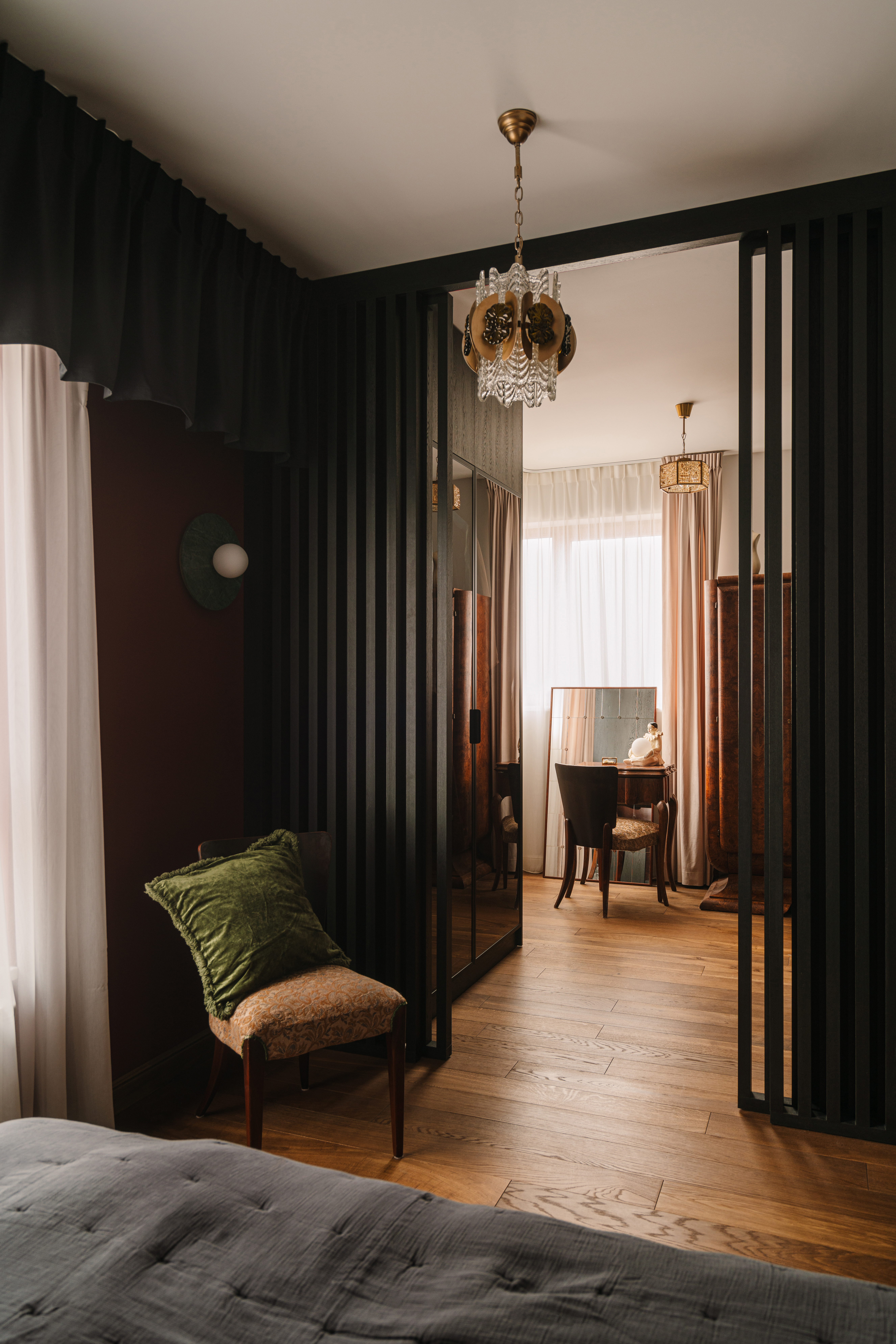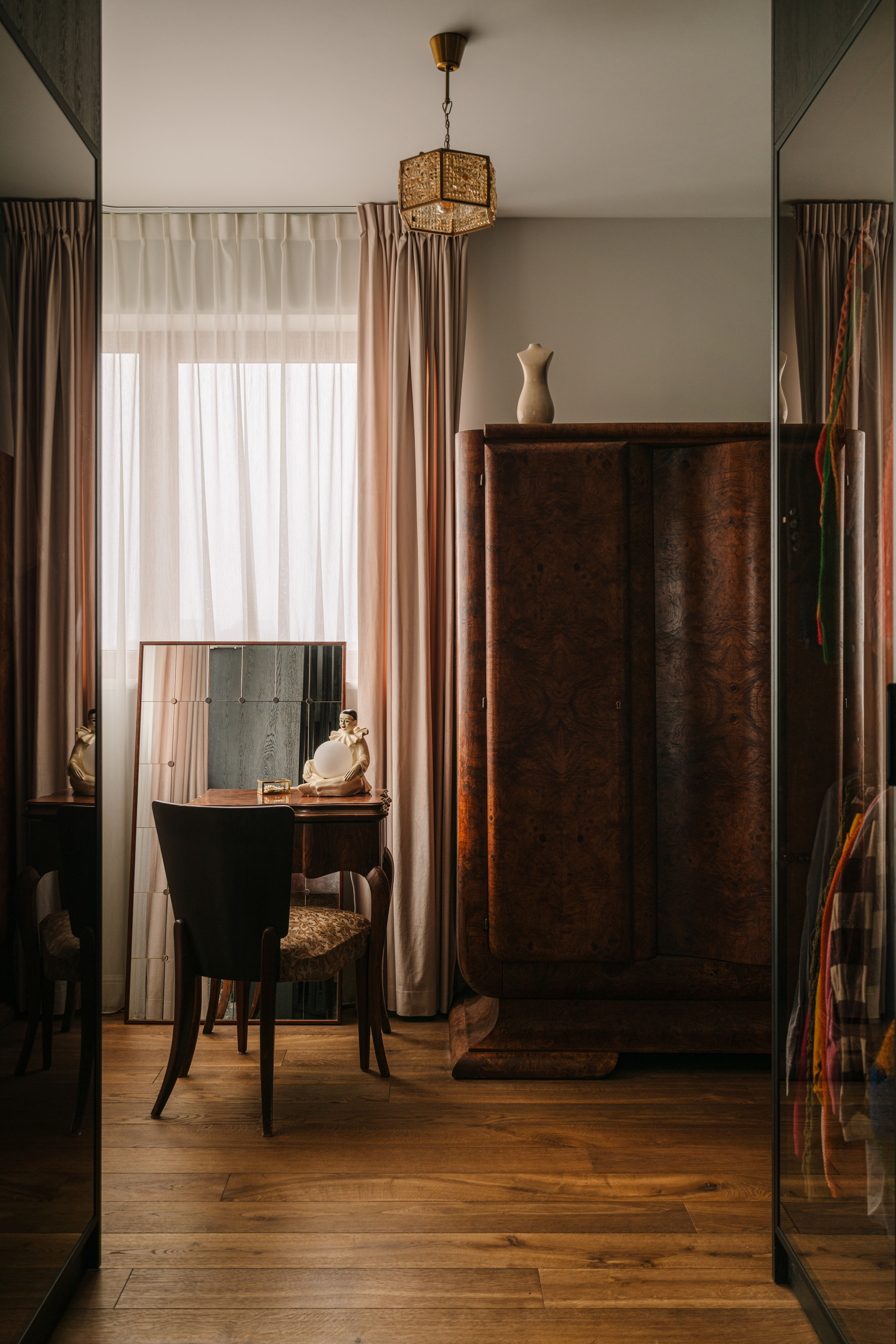 Apartament artystki zachwyca eklektycznym połączeniem szlachetnych materiałów — kryształowego szkła, postarzanych luster, kamienia i drewna — uzupełnionych antycznymi meblami, finezyjną sztukaterią i subtelnym chaosem pełnym charakteru i duszy.