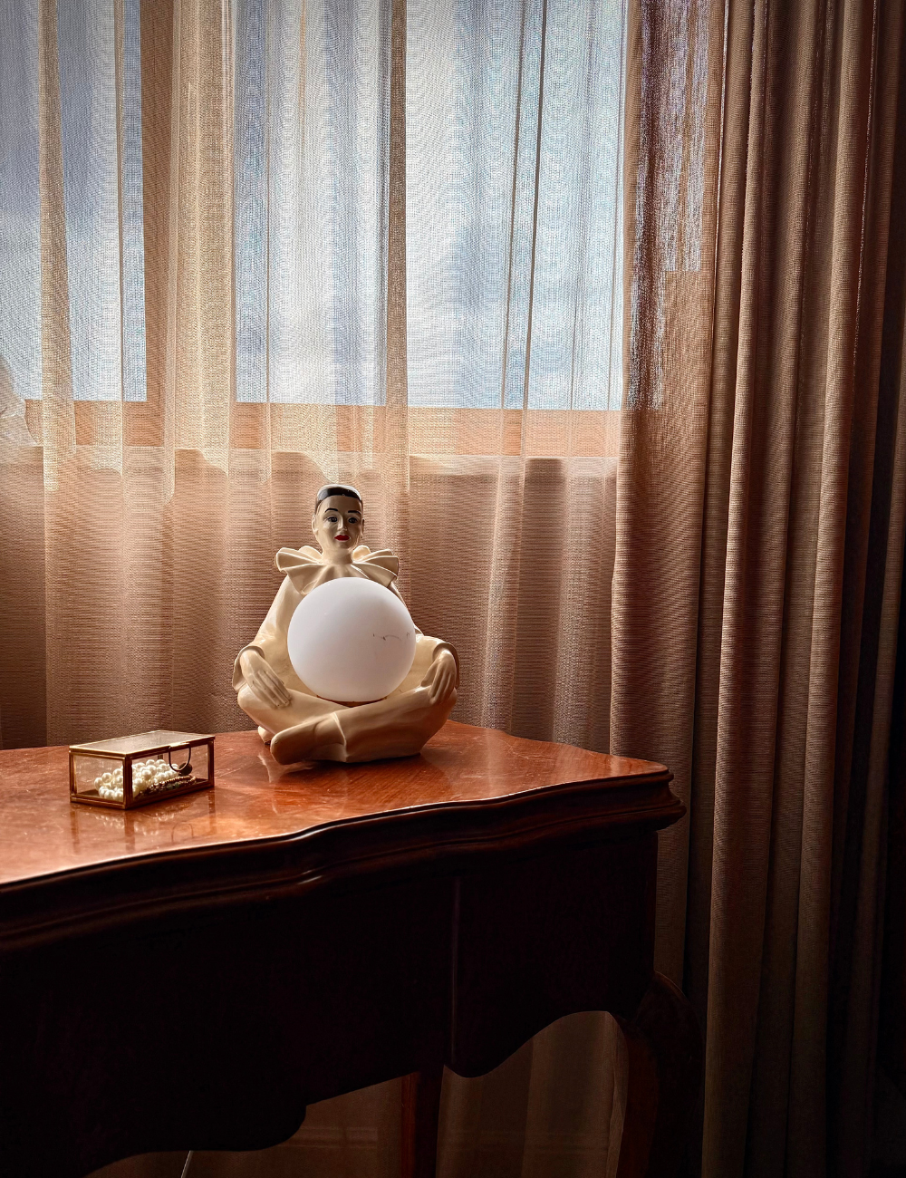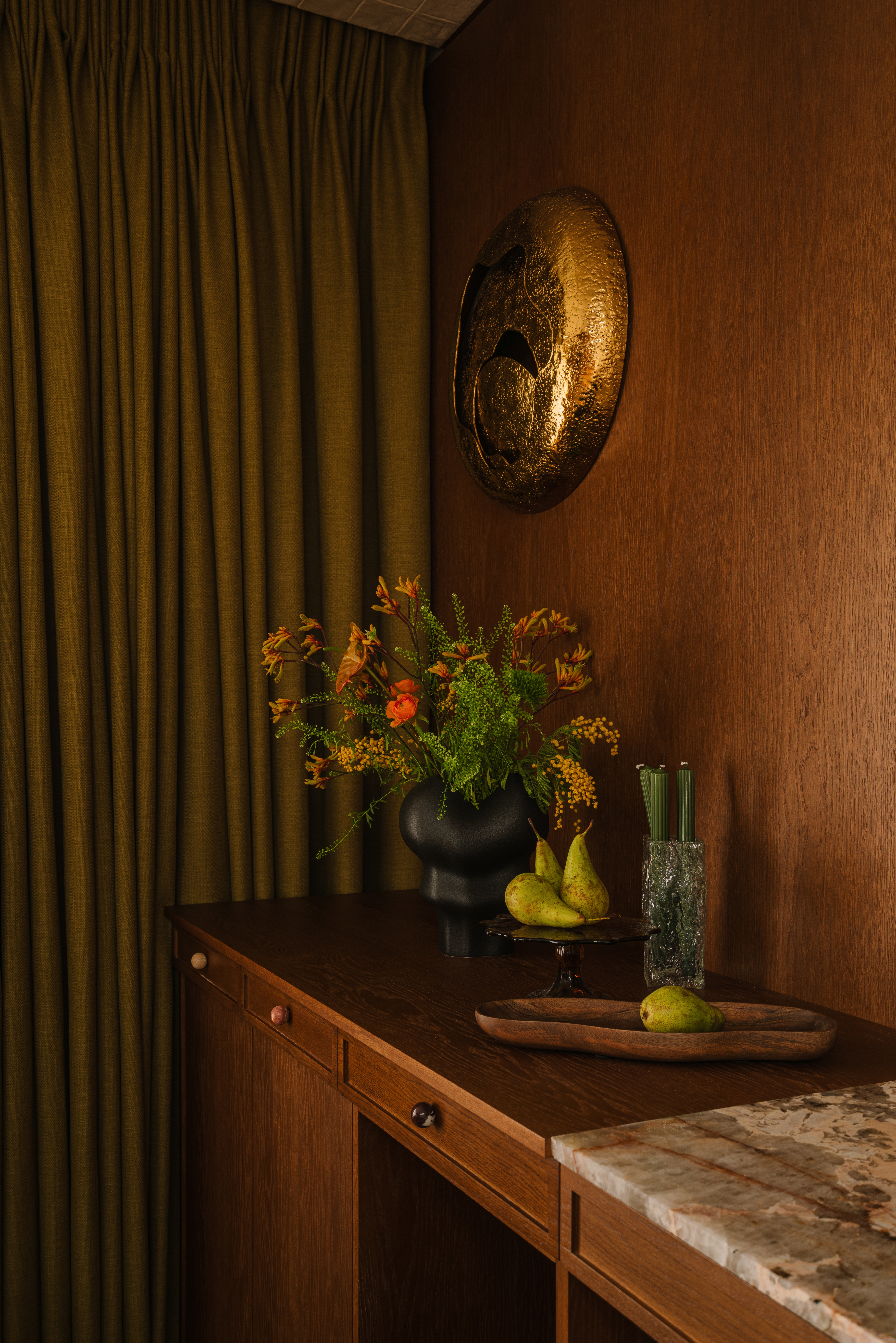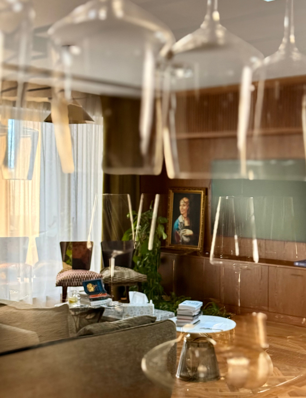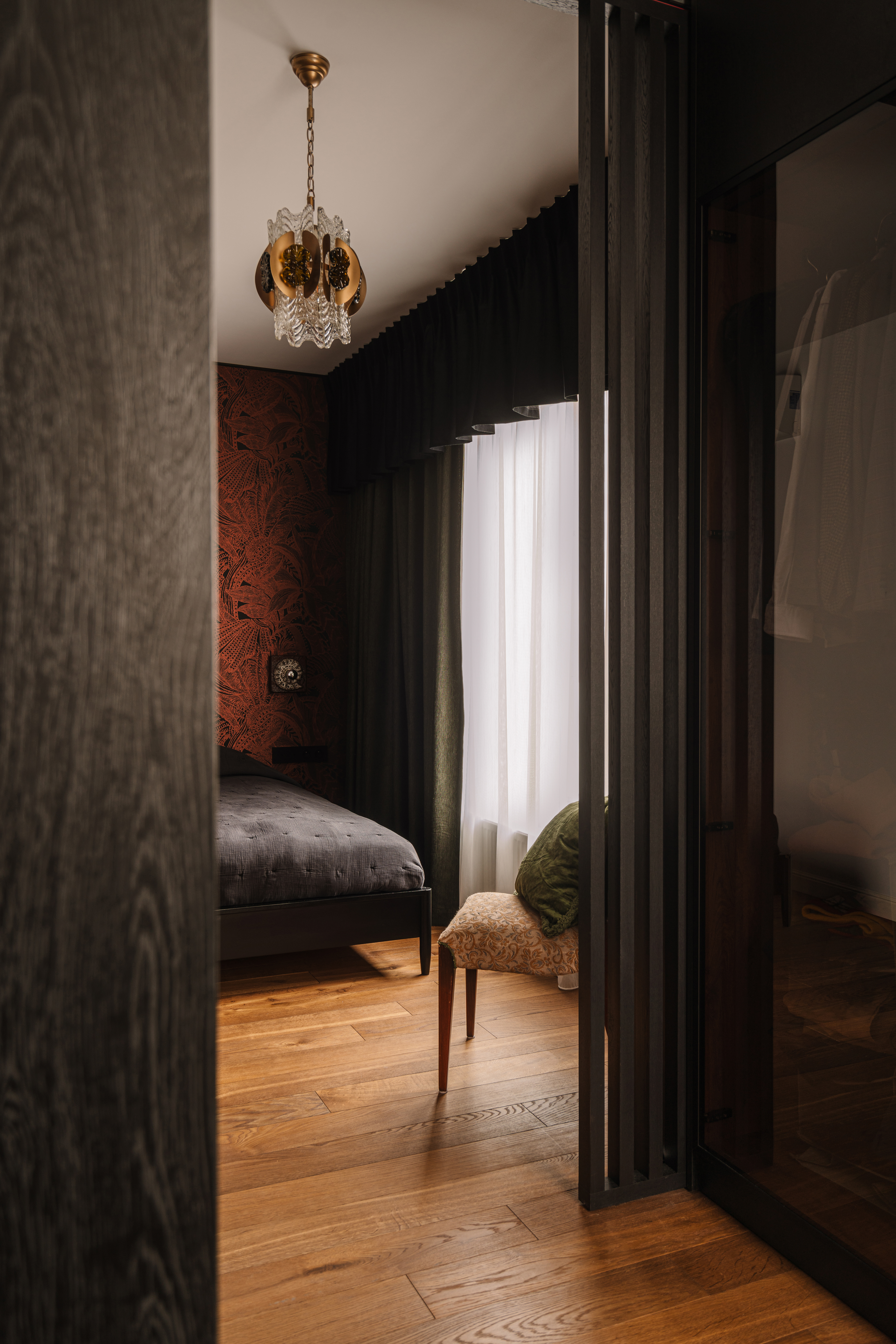 Apartament artystki zachwyca eklektycznym połączeniem szlachetnych materiałów — kryształowego szkła, postarzanych luster, kamienia i drewna — uzupełnionych antycznymi meblami, finezyjną sztukaterią i subtelnym chaosem pełnym charakteru i duszy.